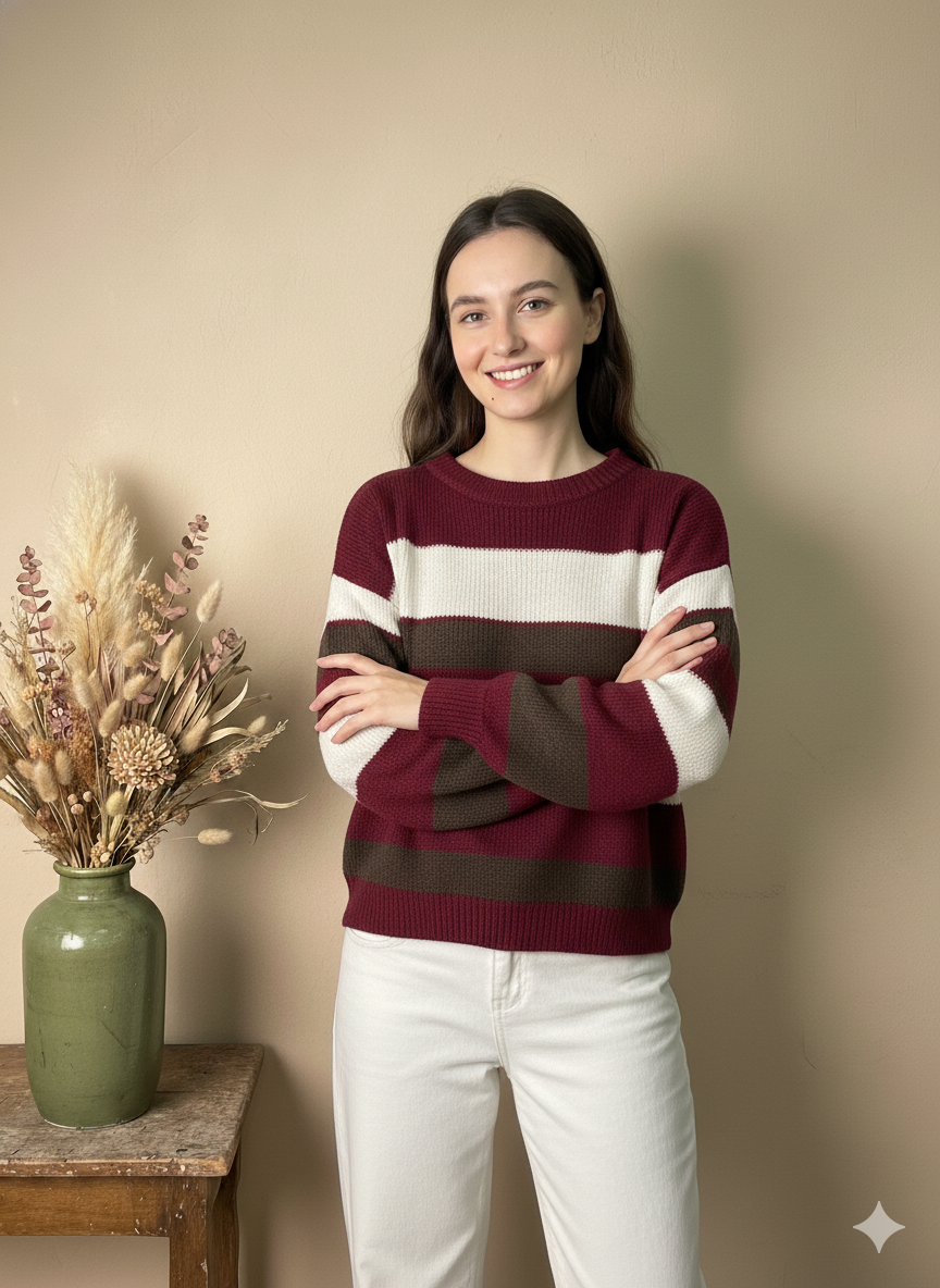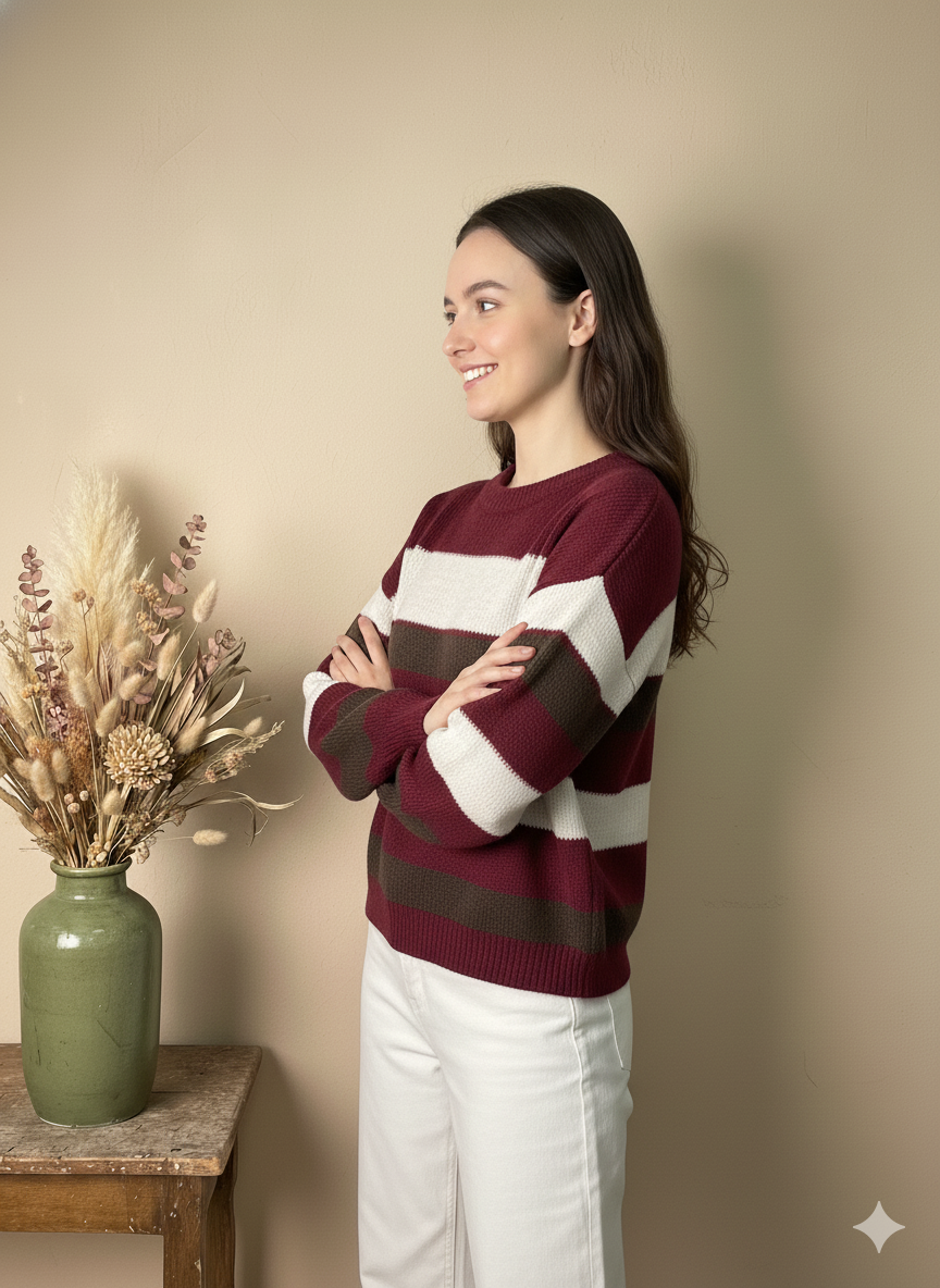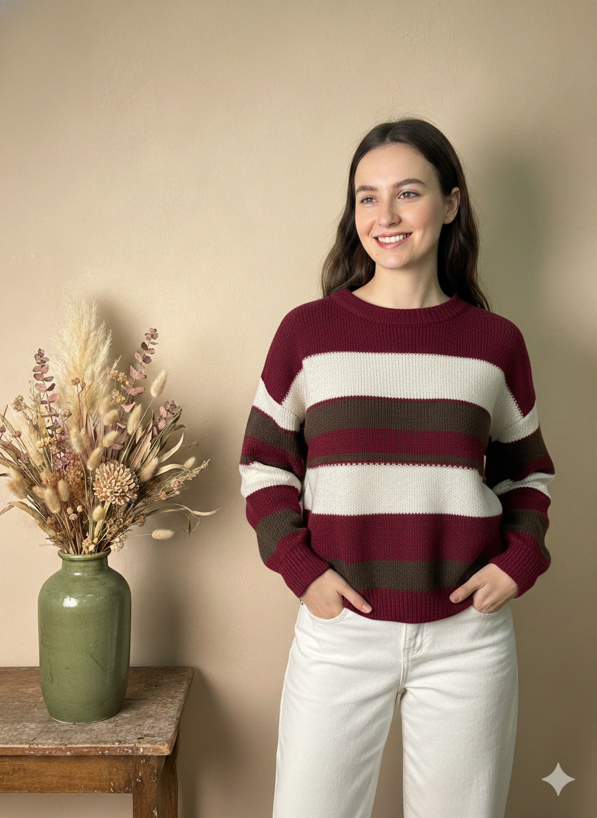 Diseño a Rayas Clásico: Presenta un patrón de rayas horizontales en una combinación de colores armoniosa: un vibrante burdeos (o rojo vino), un blanco crema suave y un acogedor marrón oscuro. Esta paleta de colores es fácil de combinar y aporta un toque de alegría a cualquier look.