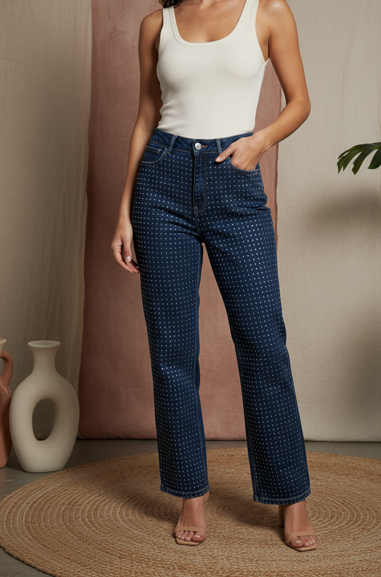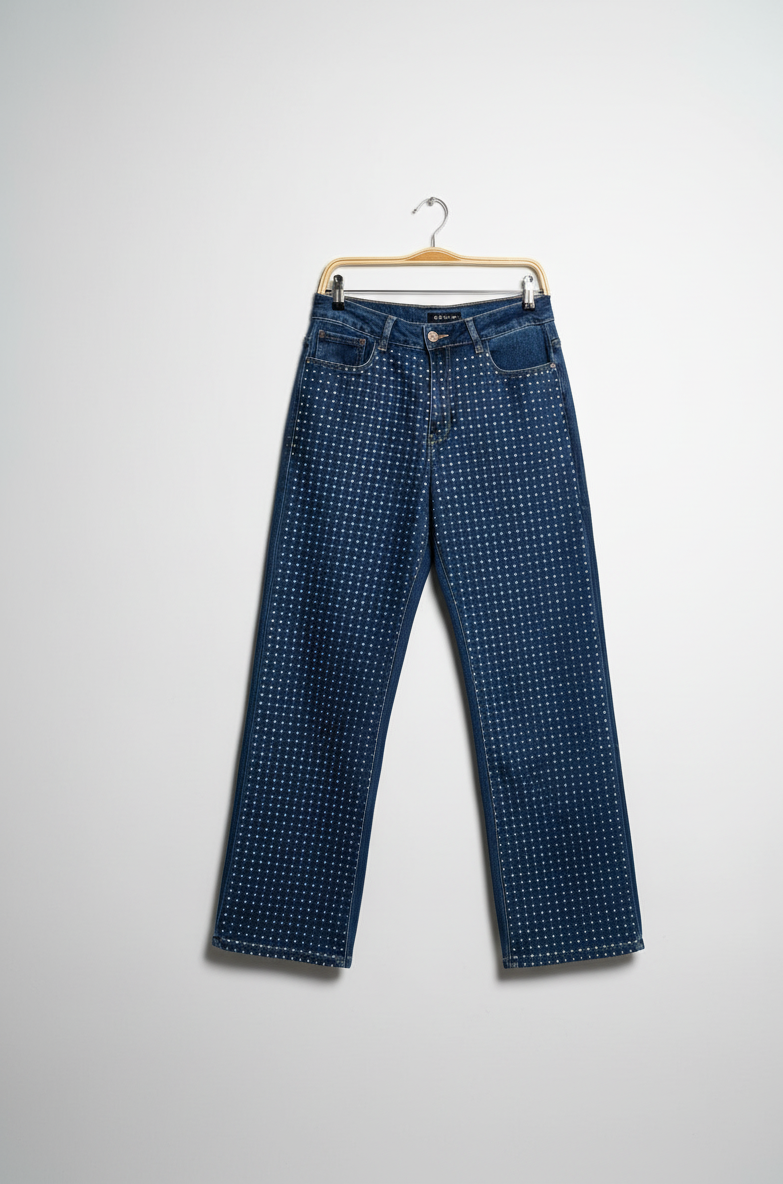 Lo que realmente los distingue son los innumerables detalles de tachuelas metálicas que cubren toda la prenda, añadiendo un brillo sutil y un aire sofisticado a tu look. El diseño de cinco bolsillos y el cierre de cremallera con botón aseguran la funcionalidad que esperas de un buen vaquero.